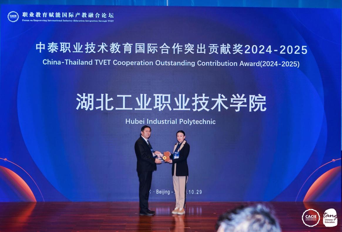 新闻网讯(通讯员 周思雨)10月29日至30日,第26届中国国际教育年会“职业教育赋能国际产教融合分论坛”在北京国家会议中心举行。我校党委委员、党委宣传部(文明办)部长(主任)郑妍妍一行应邀出席。会上,我校凭借“武当工坊”项目,成功斩获由泰国教育部职业教育委员会颁发的“中泰职教国际合作突出贡献奖(2024-2025)”。本次共有34所中国职业院校及机构获此殊荣。