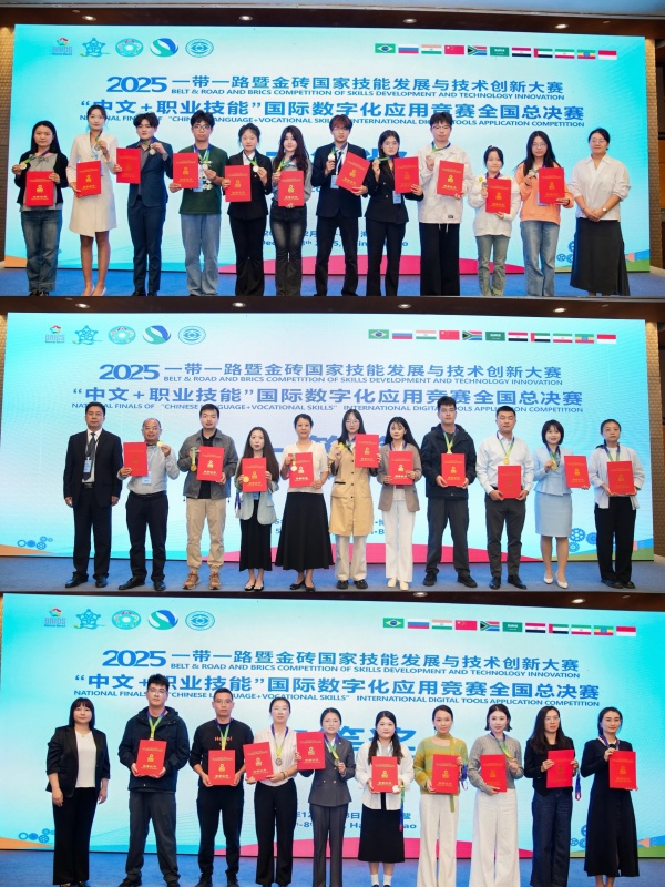 新闻网讯(通讯员 周思雨)12月8日,为期三天的2025“一带一路”暨金砖国家技能发展与技术创新大赛首届“中文+职业技能”国际数字化应用竞赛全国总决赛圆满落幕。我校师生组成的14支参赛队伍,从全国1578支队伍中脱颖而出,共荣获全国总决赛教师组一等奖1项、二等奖1项、三等奖2项;学生组一等奖1项、二等奖3项、三等奖3项,成绩斐然。