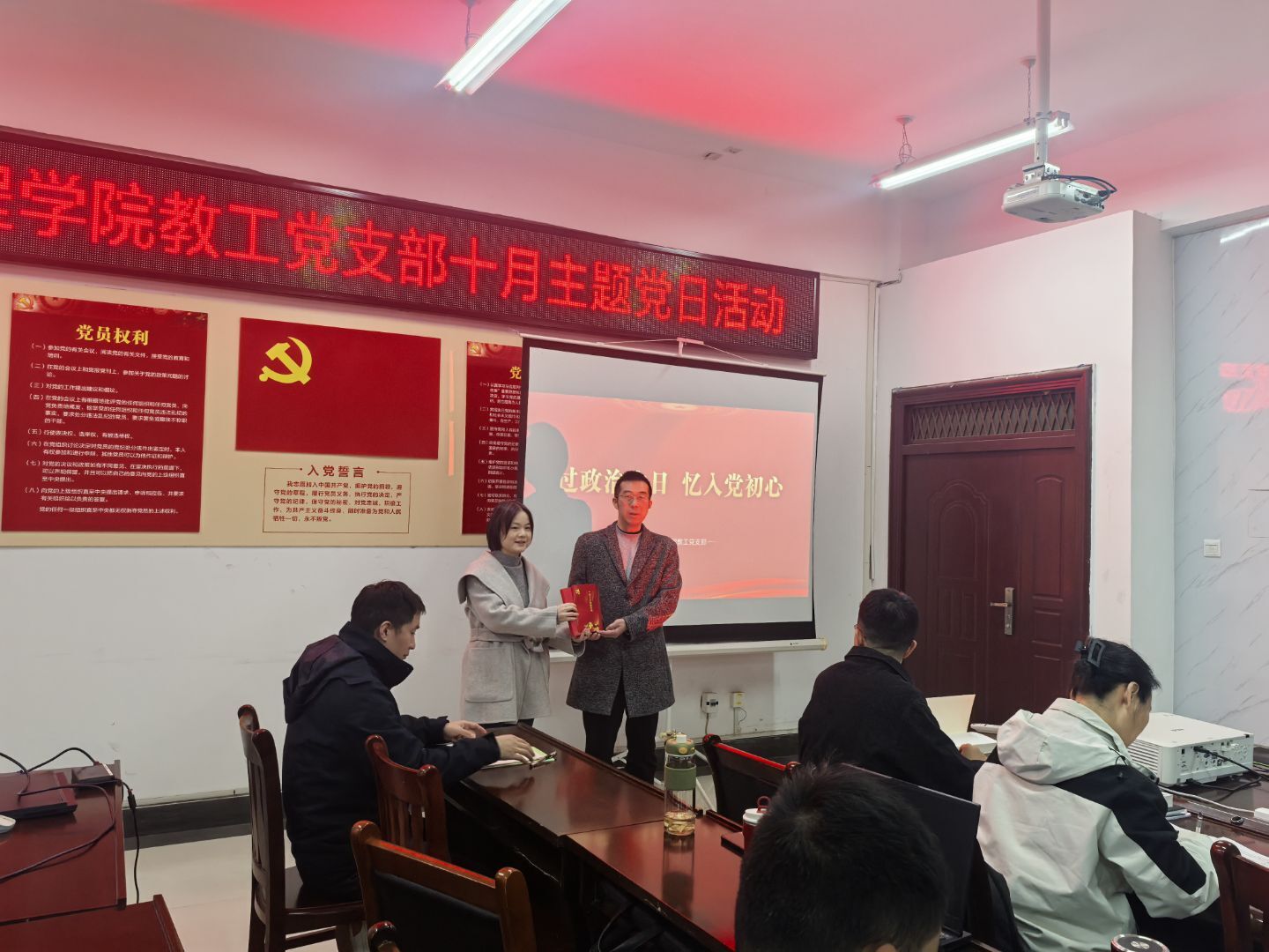 在“过政治生日”环节,进行了入党誓词,张伟同志作为领誓人,面向鲜红的党旗,带领全体与会党员高举右拳,再次许下对党的忠诚誓言。随后,教工支部书记唐克静同志为张伟同志送上了一份精心准备的“政治生日”礼物,并代表支部表达了组织的关怀和祝福。这份礼物不仅是对其过往工作的肯定,更寄托了对其未来继续发挥先锋模范作用的殷切期望。