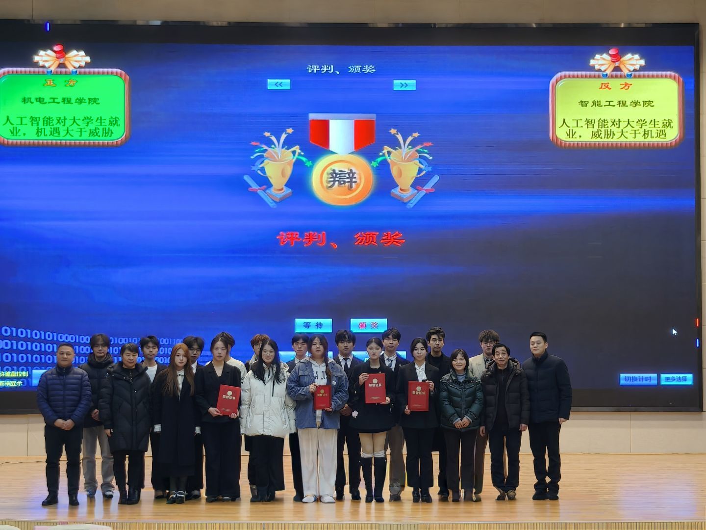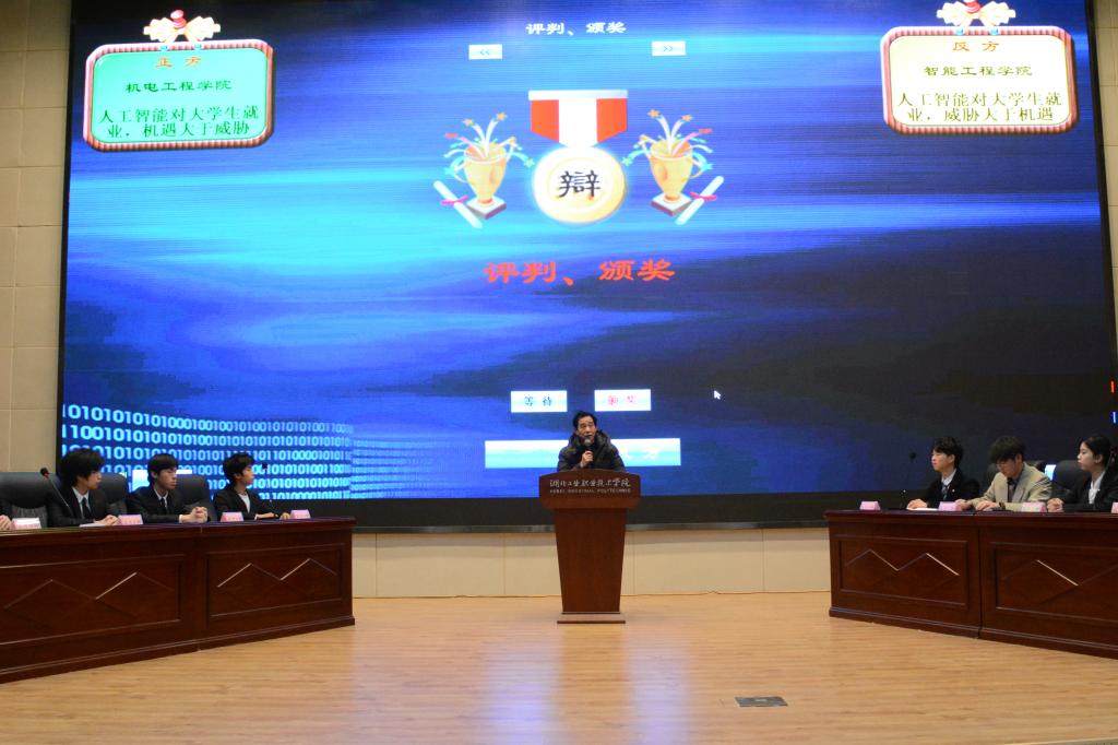 本次大学生辩论赛自11月启动以来,通过院级选拔赛、校级初赛,最终有4支参赛队伍脱颖而出冲进半决赛和决赛。决赛中,正方机电工程学院代表队和反方智能工程学院代表队以“人工智能对大学生就业,是机遇还是威胁”展开论辩,将活动现场思辨氛围推向高潮。正方以“人工智能创造新岗位、促进行业升级、释放人类创造力”为主线,论证其机遇主导;反方则从就业结构冲击、技能匹配落差、职业不确定性等角度,阐述了人工智能带来的挑战与威胁。双方引数据、举实例、析理论,展现了扎实的准备与临场应变能力。