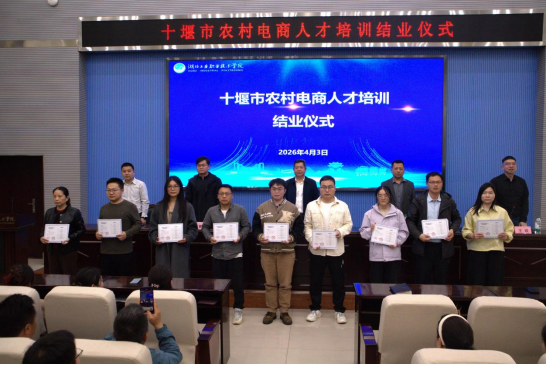 随后,市农业农村局党组成员、市水产局局长陈少斌、社会培训学院院长黄锐、旅游商贸学院院长罗立明共同为学员代表颁发结业证书。陈少斌对本次培训的组织与教学成效给予充分肯定,并向全体学员提出四点希望:一是要学以致用,将培训所学技能迅速应用到实际生产经营中,真正把手机变成“新农具”、把直播变成“新农活”;二是要示范带动,发挥好“传帮带”作用,辐射带动周边更多农户投身农村电商,形成“培训一人、带动一片”的良好局面;三是要打造品牌,深挖本地农特产品文化内涵,讲好乡村故事,打造一批具有十堰辨识度的网红直播“爆品”;四是要持续学习,紧跟电商行业发展趋势,不断更新知识技能,在数字乡村建设的浪潮中勇立潮头。