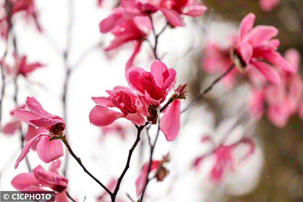 ↑2026年3月29日在甘肃省兰州大学校园内拍摄的雨中玉兰花。CICPHOTO/侯崇慧 摄