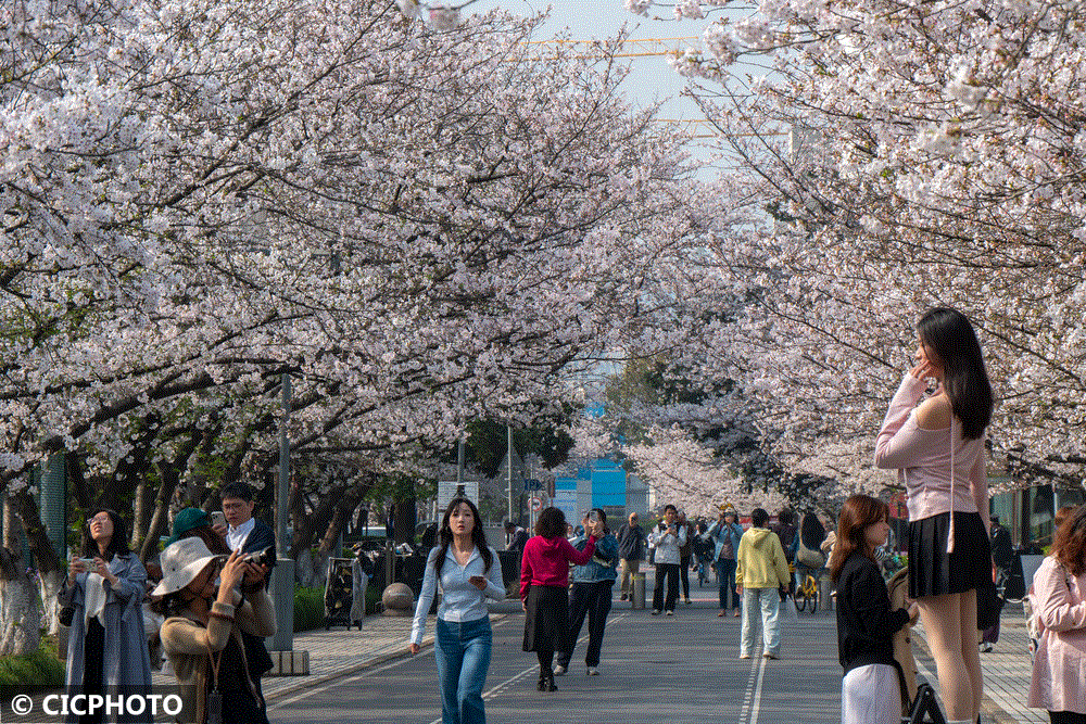 ↑2026年4月2日,位于上海市杨浦区的同济大学四平路校区樱花盛开,吸引学生和市民赏花拍照。CICPHOTO/王冈 摄