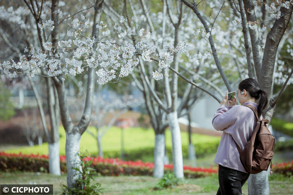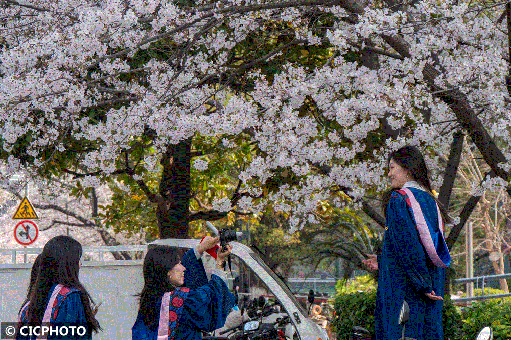 ↑2026年4月2日,位于上海市杨浦区的同济大学四平路校区樱花盛开,学生在樱花树下拍照。CICPHOTO/王冈 摄