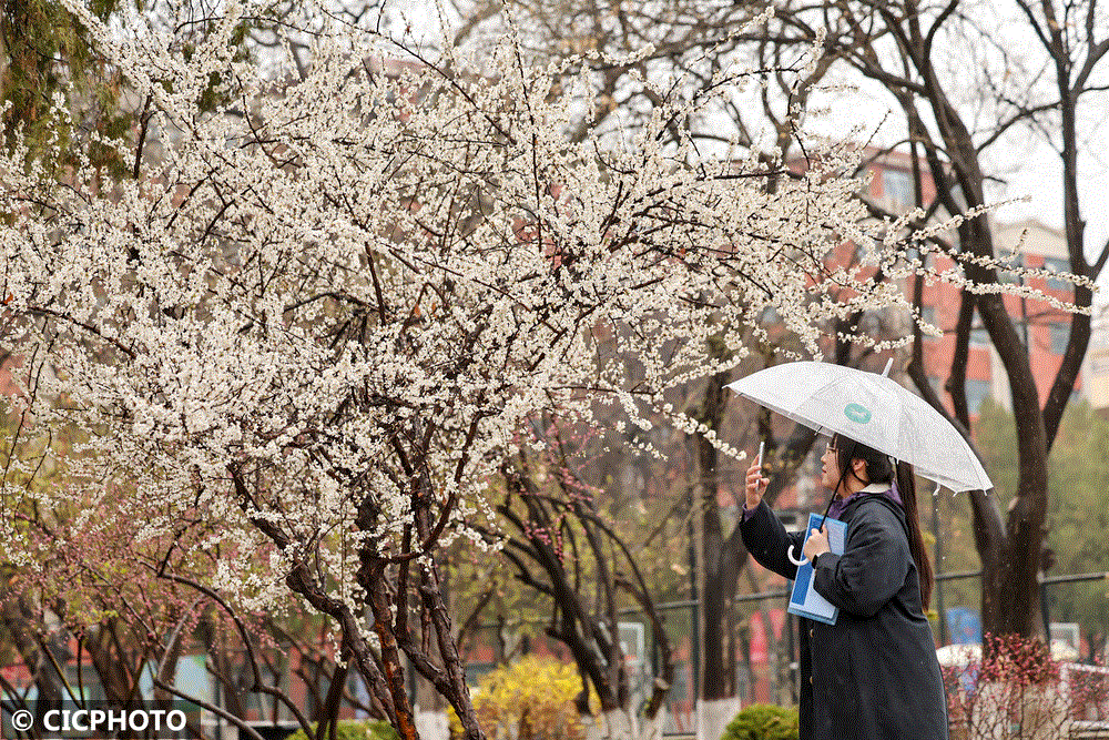 ↑2026年3月29日,在甘肃省兰州大学校园内,一名学生在雨中赏花拍照。CICPHOTO/侯崇慧 摄