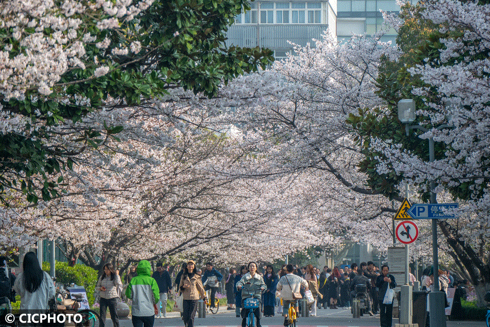 ↑2026年4月2日,位于上海市杨浦区的同济大学四平路校区樱花盛开,人们从樱花树下经过。CICPHOTO/王冈 摄