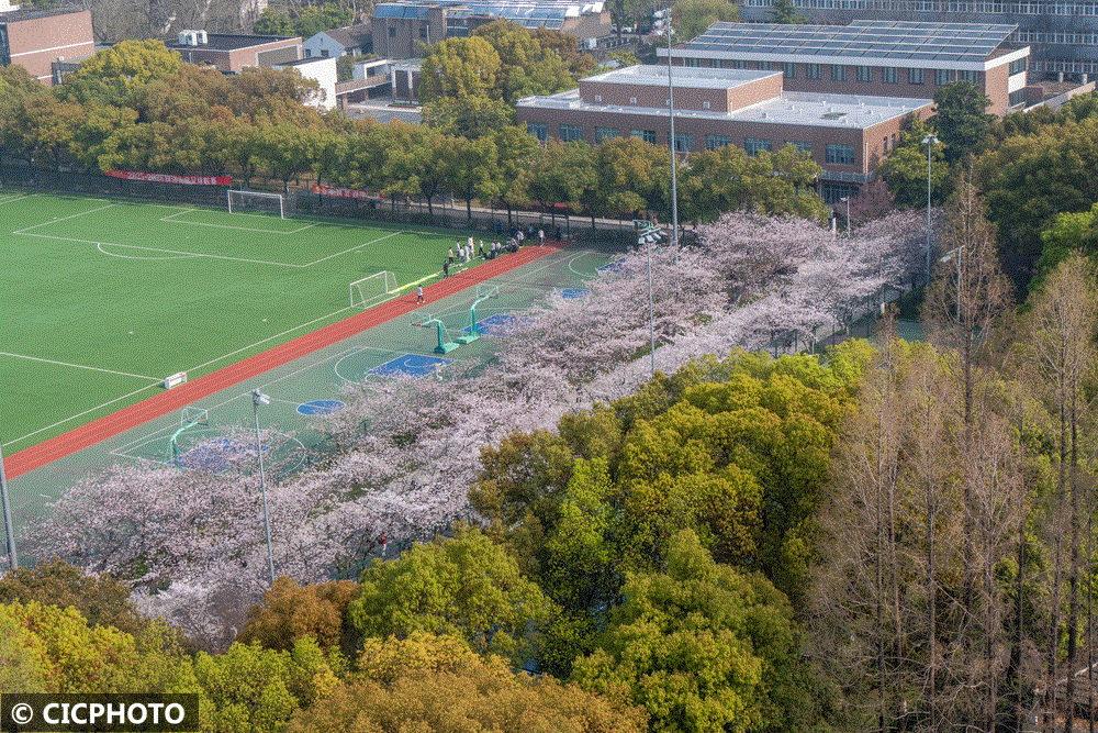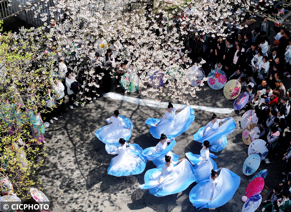 ↑2026年3月25日,在浙江省东阳市职业教育中心学校东技校区举办的樱花节上,学生们在樱花树下翩翩起舞。(无人机照片)CICPHOTO/胡扬辉 摄