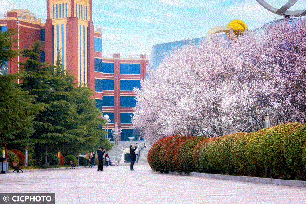 ↑2026年3月15日,在位于河南省新郑市的郑州工业应用技术学院,人们在校园里赏花拍照。CICPHOTO/赵焓 摄