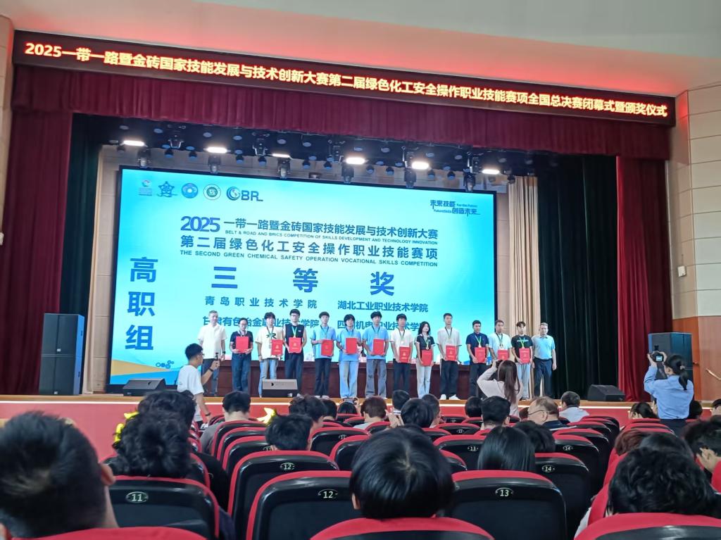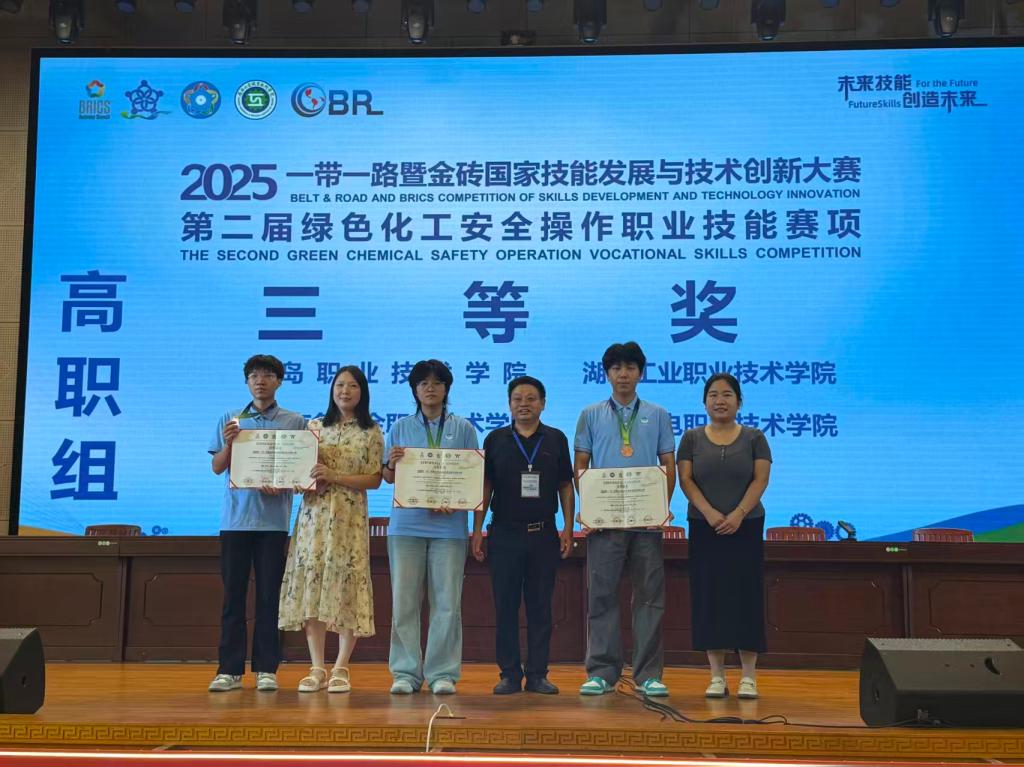 新闻网讯(通讯员 周祎 钱芹)10月17日至19日,2025一带一路暨金砖国家技能发展与技术创新大赛第二届绿色化工安全操作职业技能赛项全国总决赛在广西工业职业技术学院成功举行。来自全国各地的43支优秀队伍参与决赛。经过激烈角逐,我校丹江特色产业学院(汉江科技学校)王开林、何梦老师指导的2024级药品生物技术专业、环境监测专业学生阮涵文、管振权、张清语团队经过层层比拼,最终获得全国总决赛三等奖,为学校赢得了荣誉。