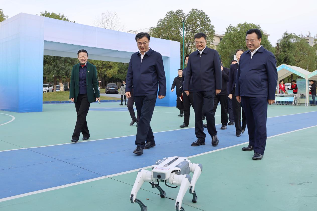黄剑雄一行沿校园主轴线杜鹃梯路前进,一路察看校园生态环境与基础设施布局,一行人最终抵达体育馆前广场,重点参观了学校近期正在举办的职业教育教学成果展。