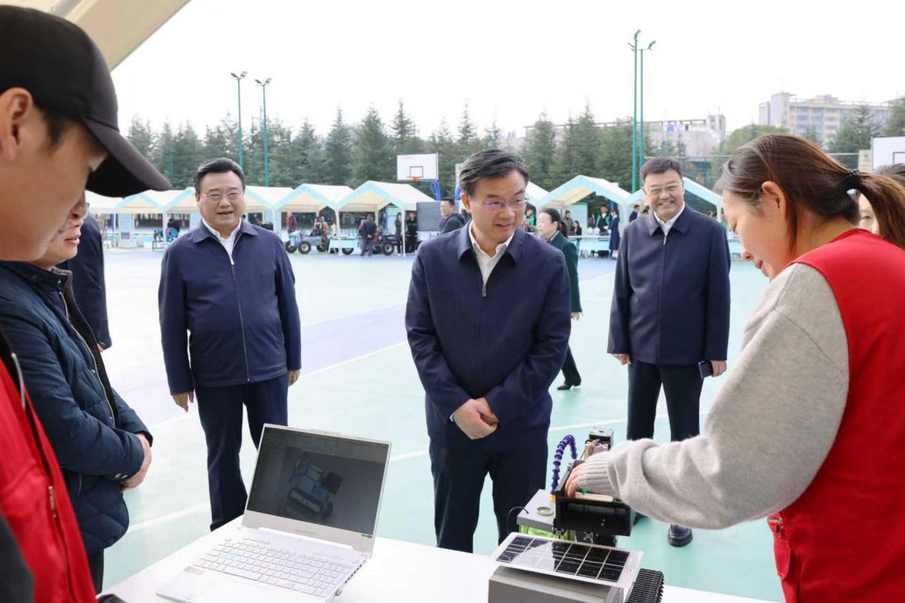在成果展现场,黄剑雄与参展学生亲切交流,询问职业教育成果与实践应用前景。他对学生们展现出的创新思维和实践能力给予了高度评价,同时勉励同学们要把创意转化为可以落地的技术成果与产业项目,主动对接十堰“一主四优多支撑”产业体系需求,让成果在实践中实现价值。