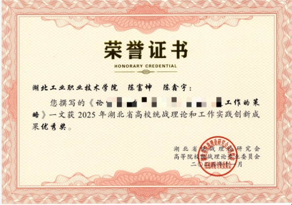 新闻网讯(通讯员 吕帅)近日,湖北省高校统战理论研究会第40次学术年会在长江大学圆满落幕,会议对2025年湖北省高校优秀统战理论和工作实践创新成果进行了表彰。我校共选送8篇统战理论与工作实践论文成果,其中2篇从全省35个本专科院校的291篇参评作品中脱颖而出,分获三等奖和优秀奖,不仅创下我校在该奖项中的历史最佳成绩,更成为本次表彰中全省两所获奖的高职高专院校之一,且以“双奖项”在同类院校中展现出显著优势,彰显了我校在统战理论研究与实践创新领域的职教特色与领先水平。