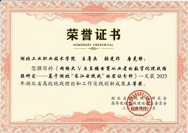 据了解,此次获奖成果紧紧围绕贯彻落实党的二十大精神和习近平总书记关于做好新时代党的统一战线工作的重要思想,聚焦新时代统战工作的重点难点问题。建筑工程学院王厚兵等撰写的“网络大V与直播电商从业者的数字化统战路径”和十堰电大(教院)陈富坤等撰写的统战研究成果均源于我校统战工作的长期实践积累。