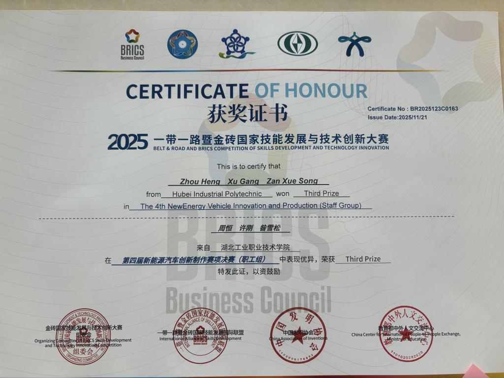 新闻网讯(通讯员 周恒)近日,在山东省济南市举办的2025一带一路暨金砖国家技能发展与技术创新大赛第四届新能源汽车创新制作赛项决赛圆满落幕。由我校汽车工程学院周恒、许刚、昝雪松三位教师组成的参赛队伍在全国众多参赛队伍中凭借扎实的专业技能和稳定的临场发挥脱颖而出,获得教师组三等奖。