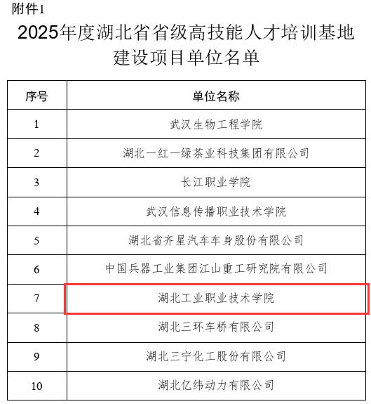此次全省共评选出了高技能人才培训基地10家单位、技能大师工作室20家单位。我校两个项目同时入选,既是对学校过往办学实力与技能人才培养成果的肯定,更是开启高技能人才培养新篇章的全新起点。未来,学校将以省级高技能人才培训基地建设为抓手,聚焦“培养高技能人才、服务地方产业发展”,进一步整合优质教学资源,升级实训设施设备,创新技能培训课程体系,打造高标准的技能人才培育平台,充分发挥基地的示范辐射作用,输送更多“懂技术、善操作、能创新”的高素质高技能人才,为区域产业发展贡献“湖工职力量”!