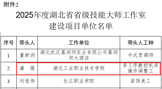 近日,湖北省人力资源与社会保障厅、省财政厅公布了“2025年湖北省省级高技能人才培训基地和技能大师工作室建设项目名单”,我校首次获批省级高技能人才培训基地,建设方向工业机器人技术、无人机应用技术、机械制造及自动化,同时,机电工程学院教师潘强领办的“多工序数控机床操作调整工技能大师工作室”获批省级技能大师工作室。