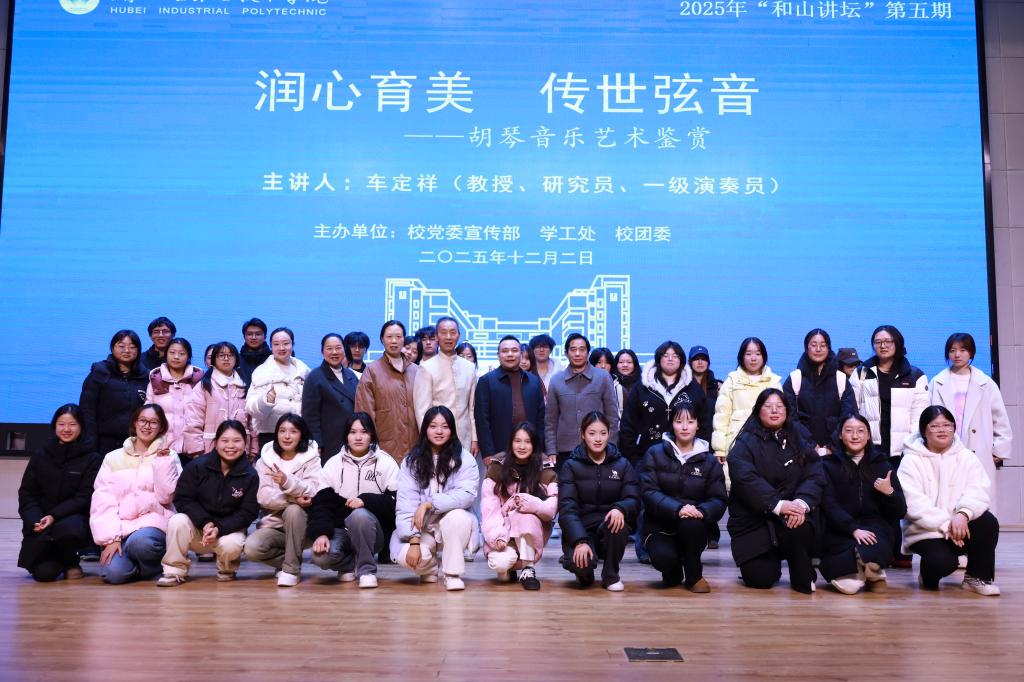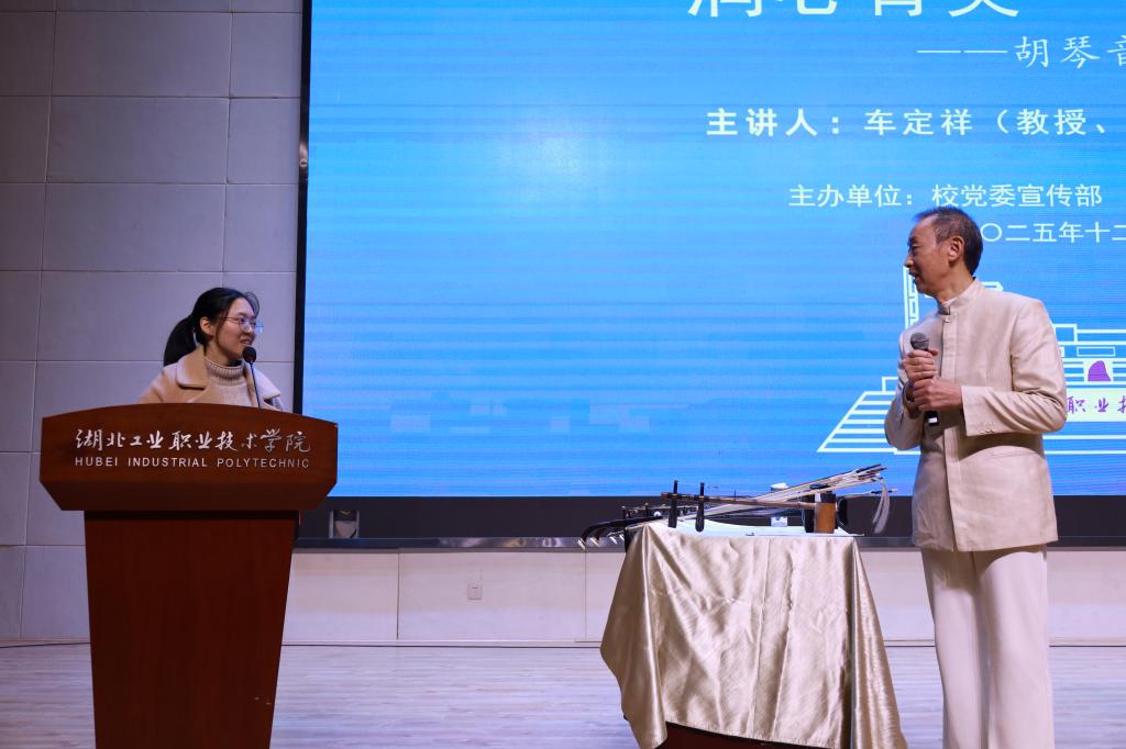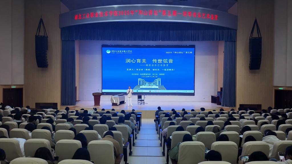 新闻网讯(文/高静 图/杨学全 余航利)为弘扬中华优秀传统文化,让师生沉浸式感受民族器乐的独特魅力,12月2日,原荆楚理工学院副校长、民族乐器国家一级演奏员、教授、研究员车定祥做客我校和山讲坛,开展“润心育美 传世弦音”胡琴文化鉴赏讲座。副校长李爱萍,学工处、团委等职能部门负责人与来自旅游贸易学院、大学生艺术团、天一乐团的400余名师生代表齐聚现场,共赴这场音乐之约。