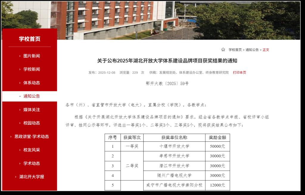 新闻网讯(通讯员 王琼)近日,湖北开放大学公布2025年体系建设品牌项目获奖结果,十堰市开放大学凭借扎实的工作成效和鲜明的品牌特色,在全省众多申报单位中脱颖而出,荣获一等奖,并获得5万元奖励资金,是本次全省唯一获此殊荣的单位。