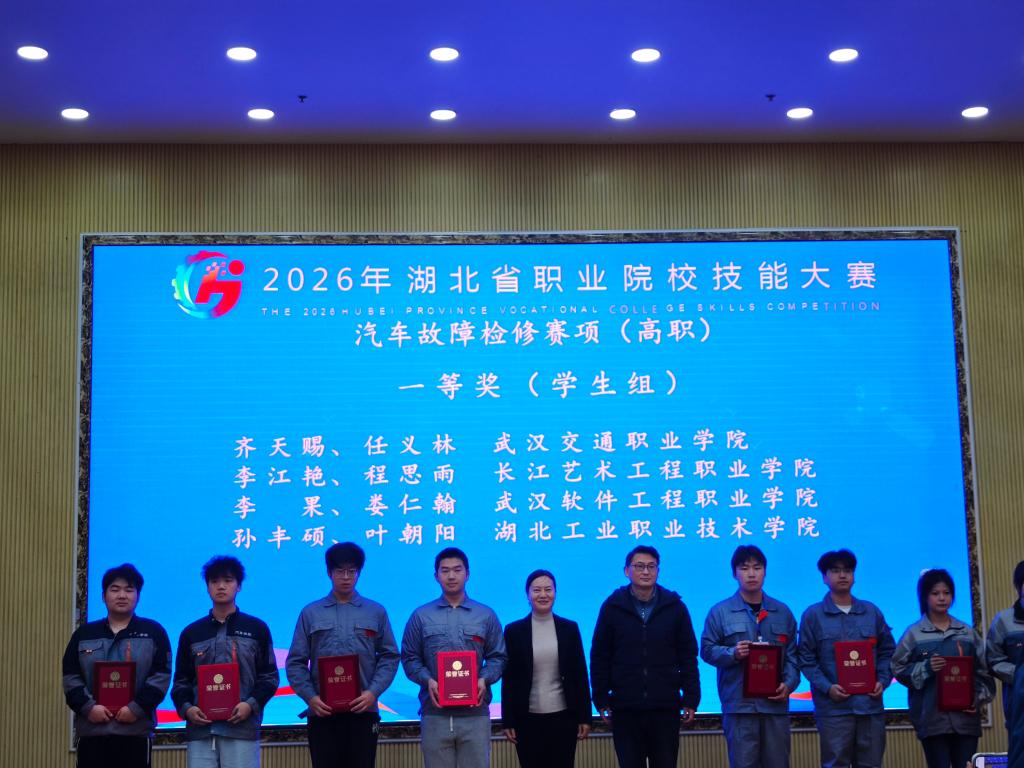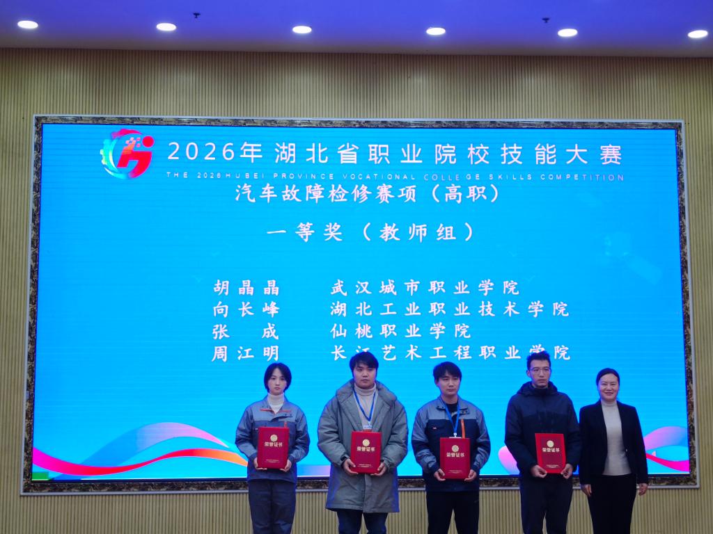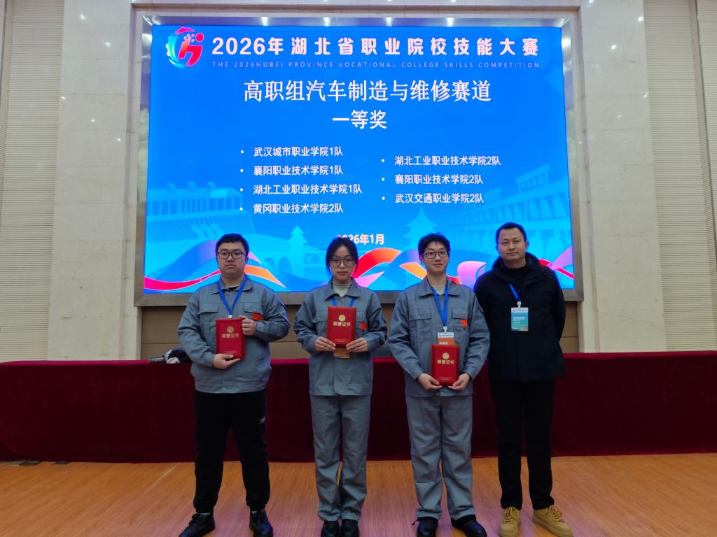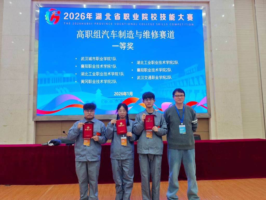新闻网讯(通讯员 赵艳杰)1月21日,2026年湖北省职业院校技能大赛圆满落幕。我校汽车工程学院师生凭借扎实过硬的专业功底、沉着冷静的临场应变能力与默契高效的团队协作,在众多参赛团队中脱颖而出,共斩获一等奖4项、二等奖1项、三等奖1项,成功实现“全员参赛、全员获奖、全面丰收”的优异成绩。