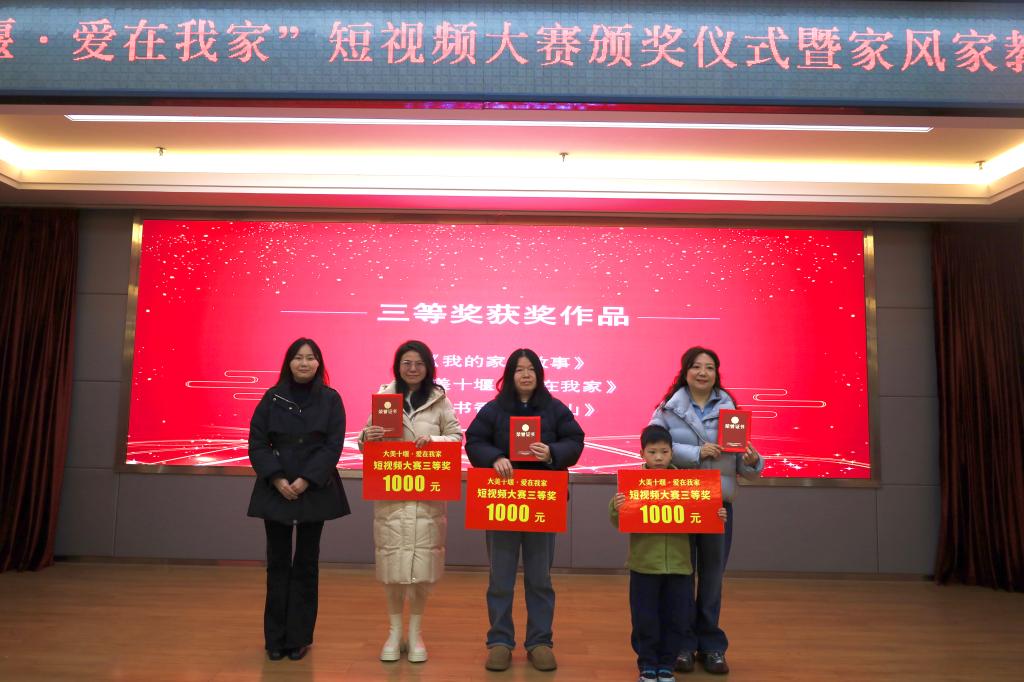 新闻网讯(文/崔芳芳 图/张华雪)1月28日上午,十堰市第二届“大美十堰·爱在我家”短视频大赛颁奖仪式暨家风家教宣传展示活动在市政务服务中心隆重举行。活动现场通报表彰了获奖家庭及单位,我校心理健康教育中心教师顾婷家庭的作品喜获三等奖,学校同时荣获优秀组织奖。