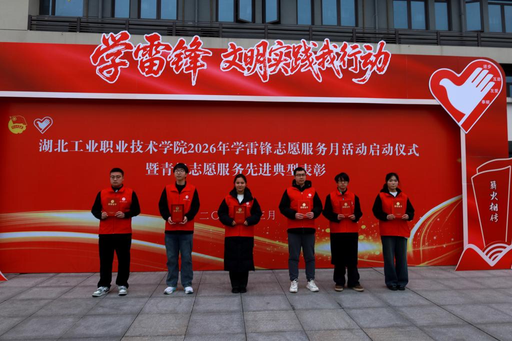 仪式上,与会领导分别为荣获2025年度“青年志愿服务优秀团体”“五星级志愿者”“无偿献血先进个人”称号的集体和个人颁发荣誉奖牌和证书,副校长李爱萍为青年志愿者服务队授旗,宣布我校学雷锋志愿服务月活动正式启动。