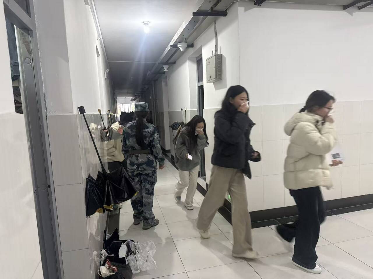 全民实操考核,技能人人过关。深夜,宿舍“突发”模拟火警,嘉园3公寓学生迅速按预设路线有序疏散。宿舍管理员和驻校教官分层引导,仅5分钟便全部安全撤离至指定区域。
