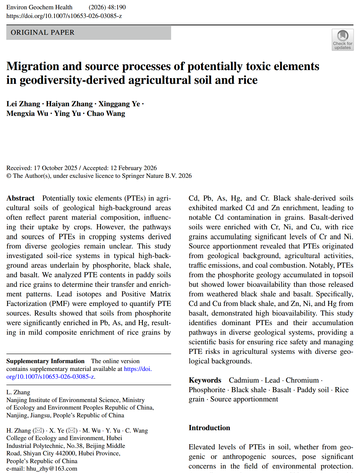两篇论文分别发表于JCR分区Q1期刊《Environmental Geochemistry and Health》(Zhang, L., Zhang, H., Ye, X. et al. Migration and source processes of potentially toxic elements in geodiversity-derived agricultural soil and rice.Environ Geochem Health48, 190 (2026).章海燕博士为第一通讯作者)和JCR分区Q2期刊《PeerJ》(Zhang, H., Liao, C., Wang, C. et al. Phosphatic rock weathering and agricultural activities driving the dynamics of potentially toxic elements in surface soil of weathered zone.PeerJ14, e21110(2026).章海燕博士和廖长广博士为共同第一作者),研究内容聚焦地质高背景区土壤-水稻系统中潜在有毒元素(PTEs)的迁移转化机制。两篇论文我校均为第一完成单位。