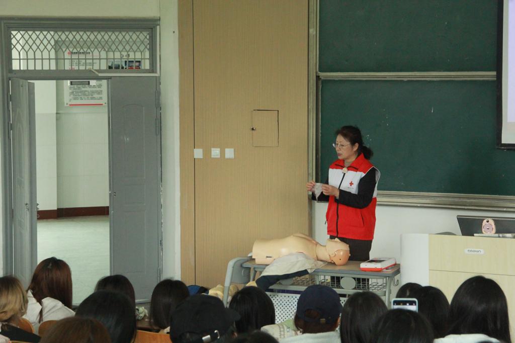 当日上午,活动开展无偿献血公益宣讲,通过案例与数据阐释献血意义,激发学生公益热情。随后,专业讲师系统讲授心肺复苏及AED使用、气道异物梗阻急救(海姆立克法)、创伤救护(止血、包扎、固定、搬运)等核心知识,并结合真实案例讲解“黄金四分钟”原则,确保学生听得懂、记得住。