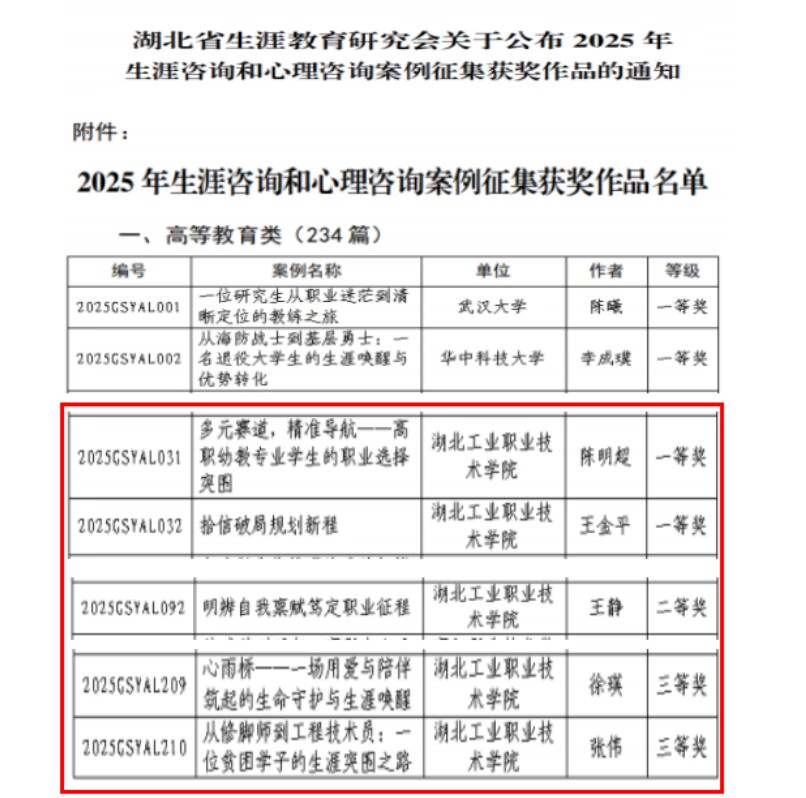 新闻网讯(通讯员 王金平)近日,湖北省生涯教育研究会正式公布2025年全省生涯咨询与心理咨询案例征集评选结果,我校报送的5篇生涯咨询案例全部斩获佳绩,其中一等奖2项、二等奖1项、三等奖2项,充分彰显了学校在生涯教育与就业指导领域的专业素养和扎实成效。