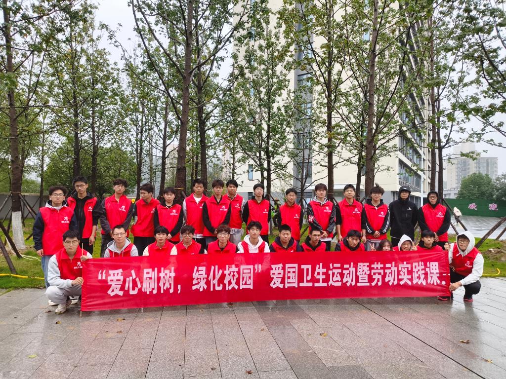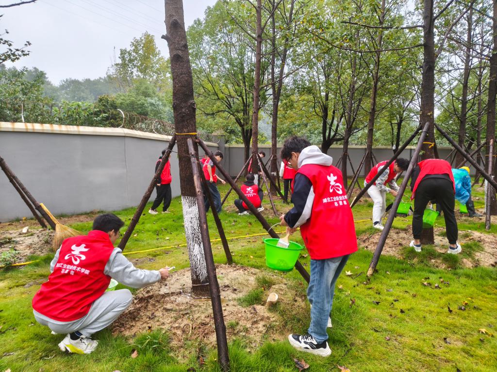本次活动创新性地让学生与物业公司和绿化公司工作人员携手合作,共分为4 个小组,围绕校园环境优化开展了一系列针对性的劳动任务,用实际行动诠释劳动的意义,传递积极向上的精神风貌。第一组由后勤物业消杀人员沿着校园大小路对校园进行整体消杀任务,为全校师生的健康安全筑起了一道坚实的防线。第二组的任务是从和山会堂出发,沿着周边沟渠进行全面清扫,确保沟渠排水通畅,避免因杂物堵塞引发积水问题。第三组的同学们聚焦产教教室的白色垃圾清理工作,致力于为师生打造一个干净、整洁的学习和实践环境。物业工作人员协助同学们对清理出来的垃圾进行分类处理,向同学们普及垃圾分类知识,引导大家树立环保意识。第四组的同学们与绿化工作人员携手,为校园内的大乔树木刷上石灰粉,为树木的健康成长保驾护航。绿化工作人员首先向同学们介绍了给树木刷石灰粉的作用,不仅可以起到防冻、防虫、防蛀的效果,还能美化校园环境,同时详细演示了石灰粉的调配方法和刷涂技巧。同学们认真学习后,便开始分工合作。在刷涂过程中,同学们相互交流技巧,遇到树干表面不平整的情况,大家耐心地反复刷涂,确保每一棵大乔树木都得到妥善的呵护。看着一棵棵树木穿上了“白色防护衣”,同学们脸上都洋溢着成就感。此次为树木刷石灰粉的劳动,让同学们了解了植物养护的知识,增强了爱护校园绿植的意识,也体会到了用劳动守护生命成长的快乐。