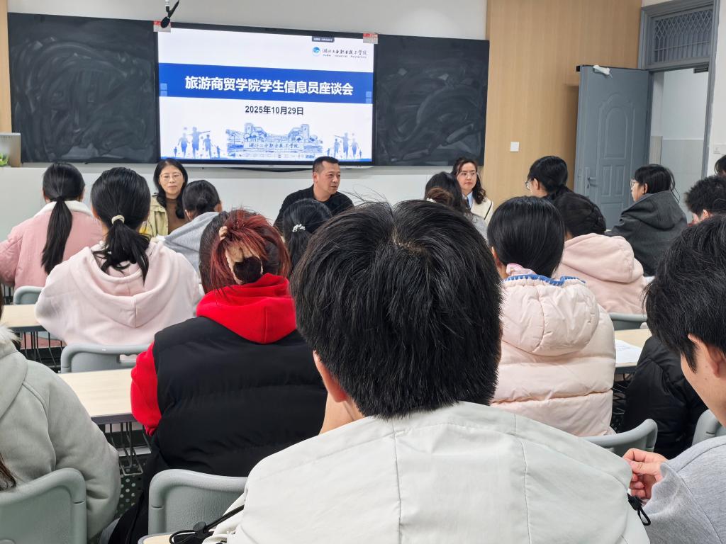 新闻网讯(通讯员 黄元元)为持续提升教育教学质量,完善教学管理与监控机制,促进师生有效沟通,旅游商贸学院于2025年10月29日下午组织召开了2025-2026学年第一学期师生信息员座谈会。会议分设学生座谈会与教师座谈会两个专场,分别在3305、3307和3505教室同步举行。学校督导、学院全体教师及学生代表共同参会。
