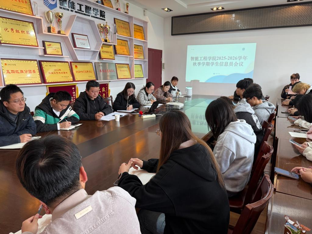 新闻网讯(通讯员李阳露)为进一步畅通师生沟通渠道,优化教学管理与服务质量,10月29日上午,智能工程学院在4412会议室召开学生信息员专题会议。学院教学相关负责人、各年级学生信息员代表参加会议。