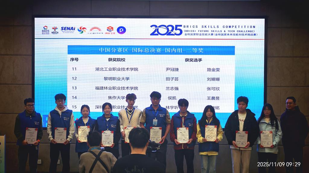 新闻网讯(通讯员 黄朝广 李芬)11月9日,在上海工艺美术职业学院闭幕的2025金砖国家职业技能大赛园艺施工虚拟仿真赛项国际总决赛中国分赛区比赛中,我校建筑工程学院学子尹冠捷、路金雯在指导教师甘汶可、李芬协同指导下,表现出色,荣获二等奖。