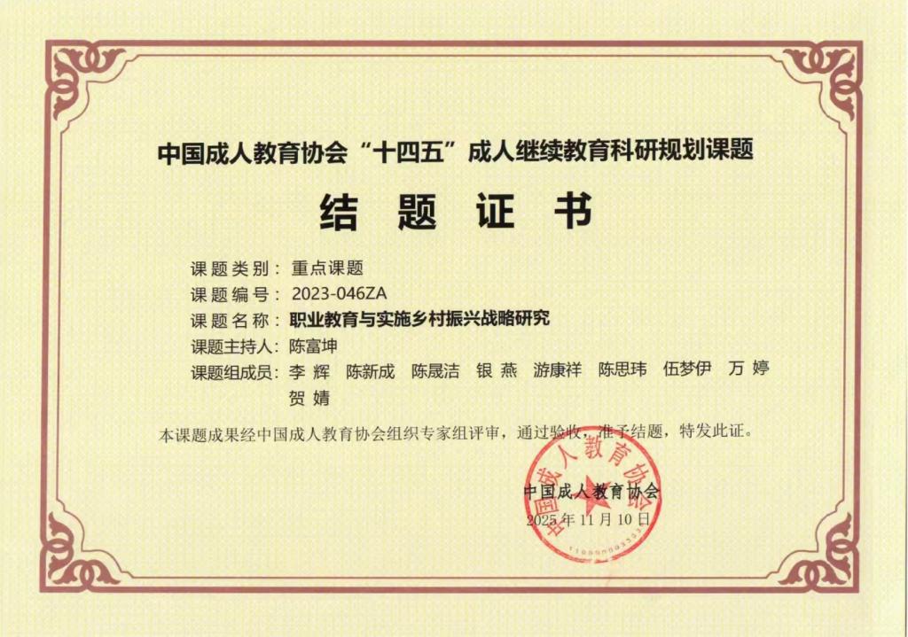 新闻网讯(通讯员 王琼)近日,从中国成人教育协会获悉,十堰电大陈富坤课题组承担的“十四五”成人继续教育科研规划重点A类课题《职业教育与实施乡村振兴战略研究》(2023-046ZA)历经两年探索,圆满达成预期目标,顺利结题。