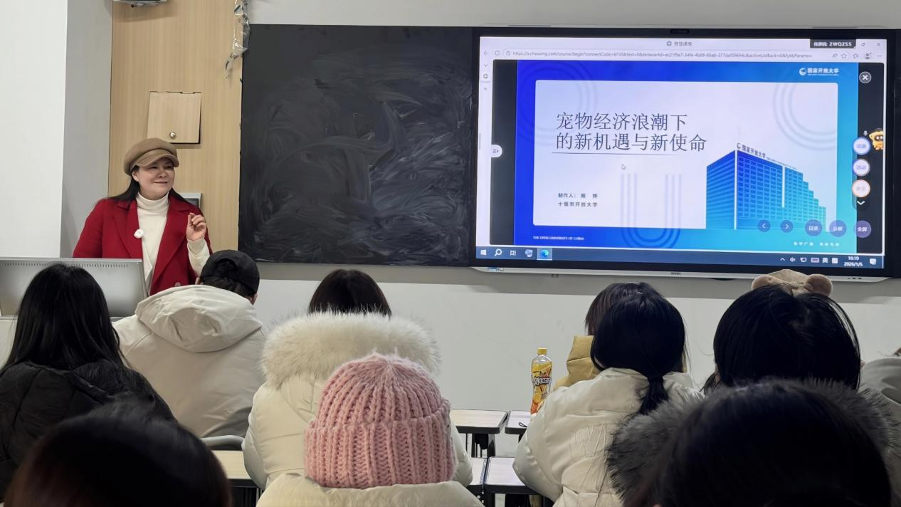 新闻网讯(文/陈富坤 图/宋静) 2026年1月5日,十堰市开放大学畜牧兽医专业执业兽医熊烨老师走进旅商学院现代家政服务与管理专业课堂,开展“宠物经济浪潮下的新机遇与新使命”主题讲座。此次讲座打破专业壁垒与教育类型界限,以跨界融合视角搭建知识桥梁,为家政专业学子拓宽职业视野、强化社会担当注入新动能。