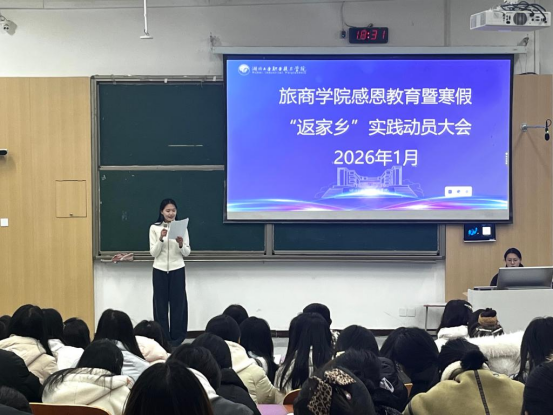 新闻网讯(文/吕佳妮 彭王瑛 图/吴椿涵 黄新月 李梦真)1月6日晚,旅游商贸学院于3101教室隆重举行感恩教育暨寒假“返家乡”社会实践活动动员大会。学院学工口全体教师及各班级学生代表齐聚一堂,在感悟感恩文化、明晰实践要求的氛围中,凝聚奋进共识,激发奉献热情。
