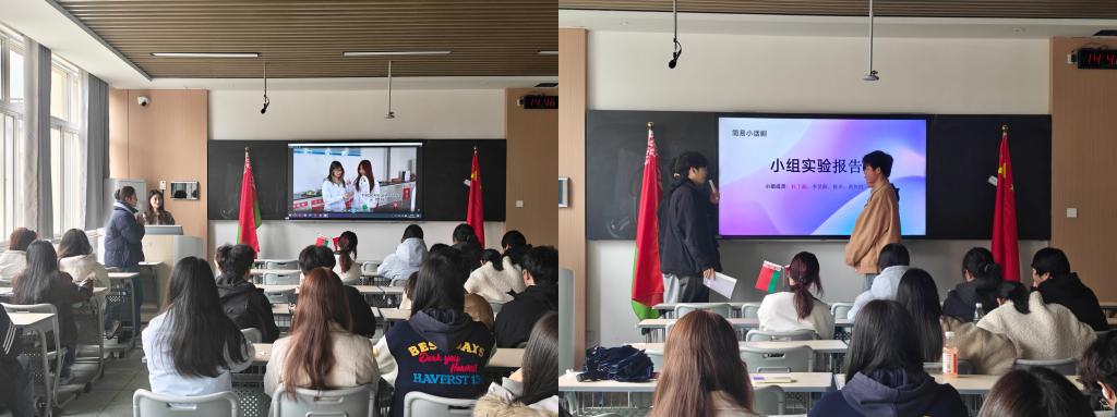 活动开始各小组按抽签顺序依次登场,精彩纷呈,亮点与专业兼具。情景短视频小组提前拍摄了“实验室的一天”、“中白友谊交流”和“食堂点餐”趣味视频,镜头感十足,将俄语词汇与专业、生活场景完美融合;简易小话剧小组以图书馆找书、小组实验报告为主题,以俄语接龙式台词完成日常对话,流畅的表达赢得现场阵阵掌声和助教的高度赞赏;创意节目小组则带来改编版俄语字母歌、俄语专业词汇快闪秀,伴随着朗朗上口的儿歌以及精彩的表演,获得了在场师生的阵阵掌声和浓厚的沉浸式俄语氛围。