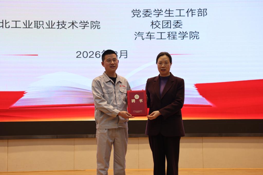 活动特邀全国五一劳动奖章获得者、国务院政府特殊津贴专家、湖北亨运集团汽车维修一级技师石校坤做客现场,分享匠心奋斗历程。活动伊始,李爱萍副校长为石校坤颁发我校兼职辅导员聘书。此次聘任是学校深化校企协同育人、拓宽思政育人载体的重要举措,旨在依托行业劳模与技术骨干的榜样力量,引领青年学子坚定职业理想、锤炼过硬技能。