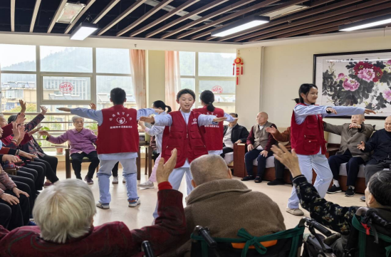 与此同时,现代家政管理与服务专业的学生们将课堂所学转化为实践。他们不仅协助护理人员为老人提供细致的生活照护,更化身“青春陪伴者”,围坐在老人身边聊天解闷,耐心倾听长者讲述过往的故事。在活动区,志愿者们还带领老人们打起了舒缓的太极操,一招一式间,不仅锻炼了身体,更拉近了两代人的距离,欢笑声与掌声交织在一起。