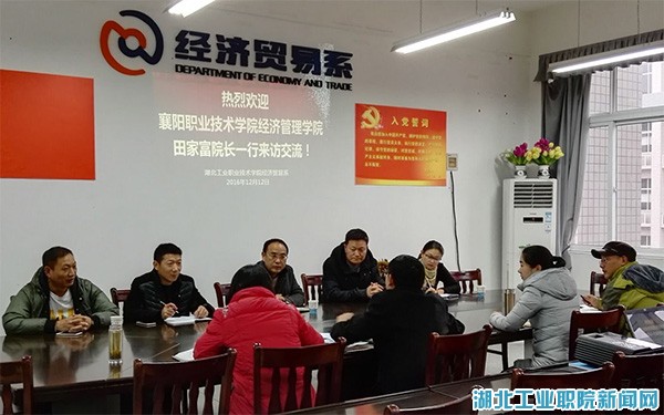 新闻网讯(文/玉声图/罗立明)12月12日,襄阳职业技术学院经济管理学院院长田家富、中航公司总经理李恕光、电子商务专业教师刘莉萍等一行5人,来我院就电子商务专业建设、实践教学和学生创业就业等工作进行考察交流。经济贸易系主任孔祥银、党总支书记张玲,副主任陈丽琴、罗立明,电子商务专业负责人郝静接待了来访客人并进行了座谈交流。