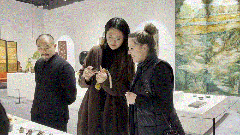 徐精宏向外国游客介绍漆艺作品。(受访者供图)