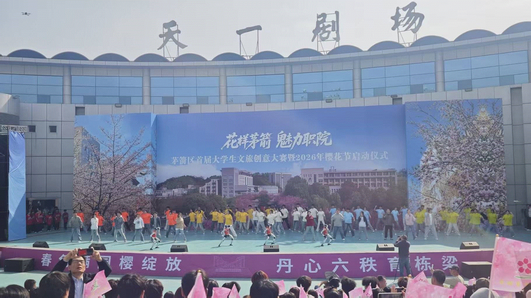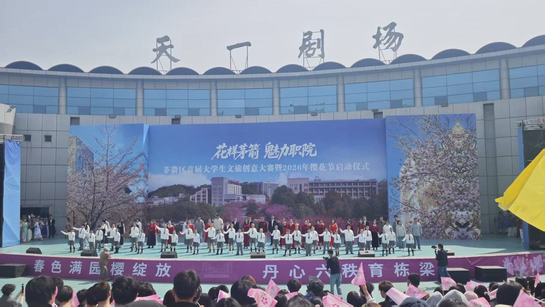 湖北日报讯(记者刘汉泽、通讯员陶亿)“欢迎来我校赏花,请文明观赏!”4月3日上午,十堰市民李晓彤来到湖北工业职业技术学院,免费、免预约进入学校观赏樱花。校园的天一剧场内,歌声嘹亮、欢声笑语——茅箭区首届大学生文旅创意大赛暨2026年樱花节正火热开场。