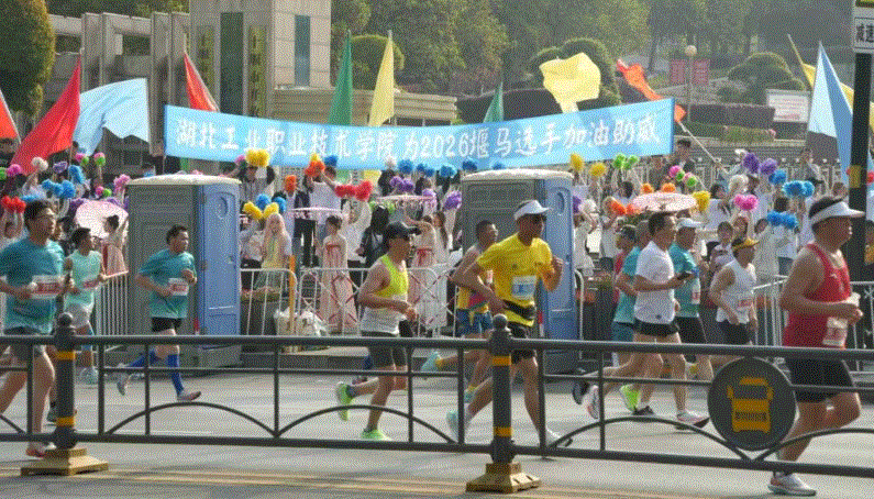 4月19日,2026十堰马拉松在十堰奥体中心鸣枪起跑。湖北工业职业技术学院组织千余名师生志愿者,在半程马拉松终点及赛道沿线提供专业服务,保障赛事顺利运行。